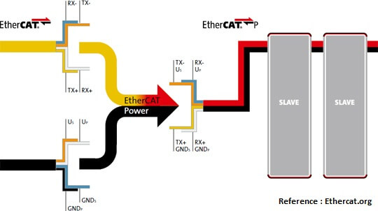 EtherCAT devices has two RJ45 ports, one for the previous node and one for the next node connected in the network.