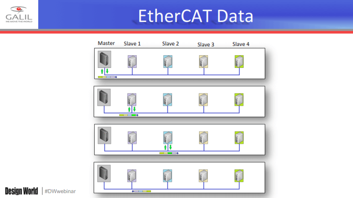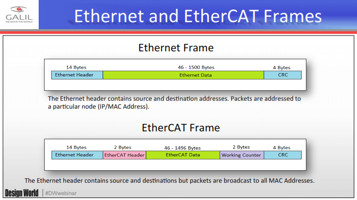 In comparison to EtherCAT, Ethernet requires a huge bandwidth for the packets been moved between master and client (which requests the data).Whereas EtherCAT works on the principle of pass-through reading, which means that the messages are not only for a single node and consumed by that node.