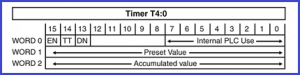 Timer instructions contain three words, with word “0” containing three bits that can be used in the program of a PLC.All timer instructions consist of three words: word 0, word 1, and word 2