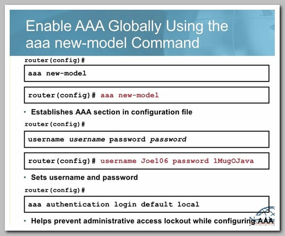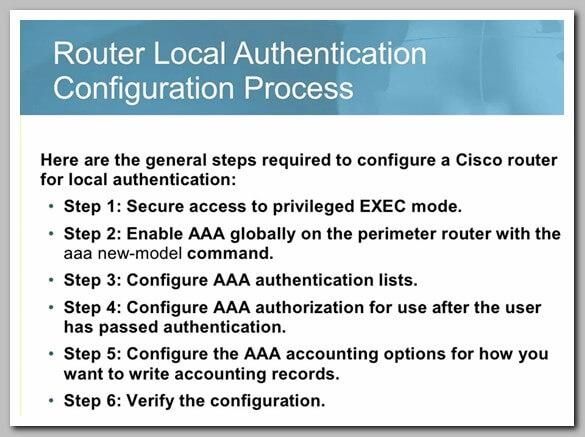 • To configure AAA for local authentication on a router first enable AAA with the aaa new model command second specify a username and password with the username password password command and third specify local authentication with the aaa authentication login default local command